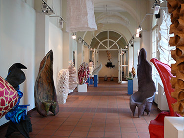 Naturphänomene also, die leisen Töne des Alltags, meist von ihrer freundlichen Seite aus betrachtet, nicht ohne Unterschwelligkeiten, aber kaum je mit dem erhobenen Zeigefinger. Luft und der alte Traum vom Fliegen führten ihn in neuester Zeit zu den großen Kegelstümpfen, Lufttrichtern sozusagen. Sie machen uns nicht nur den Raum, die darin auftretende Luftbewegung, den Lichteinfall bewußt, sondern auch die Weite unserer Umgebung, ihre Unerreichbarkeit. Weniger abstrakt lenken Segelschiffe unser Denken in ähnliche Richtungen, tun es auch die großen Blätter oder die duftigen Formationen, die mit ihrer Transparenz ganz praktischen Zwecken dienen können, Sichtschutz am Fenster beispielsweise.